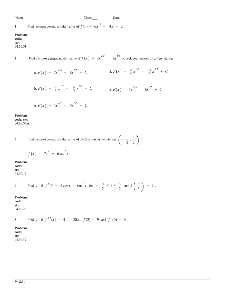 Name: 1 Class: Find the most general antiderivative of f (x) 6x Date: 2 4x + 2. Problem code: stet. 04.10.01 Find the most general antiderivative of f (x) 7x 2 a. F (x) 7x b. F (x) 14 5 c. F (x) 5x