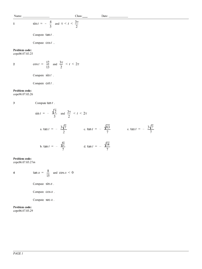 Name: 1 sin t Class: 4 and 5 Date: t 3 2 Compute tan t. Compute cos t. Problem code: copc06.07.03.25 cos t 12 and 3 t 2 13 2 2 Compute sin t. Compute cot t. Problem code: copc06.07.03.26 Compute tan