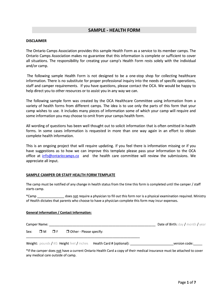 SAMPLE HEALTH FORM DISCLAIMER The Ontario Camps Association provides this sample Health Form as a service to its member camps. The Ontario Camps Association makes no guarantee that this information