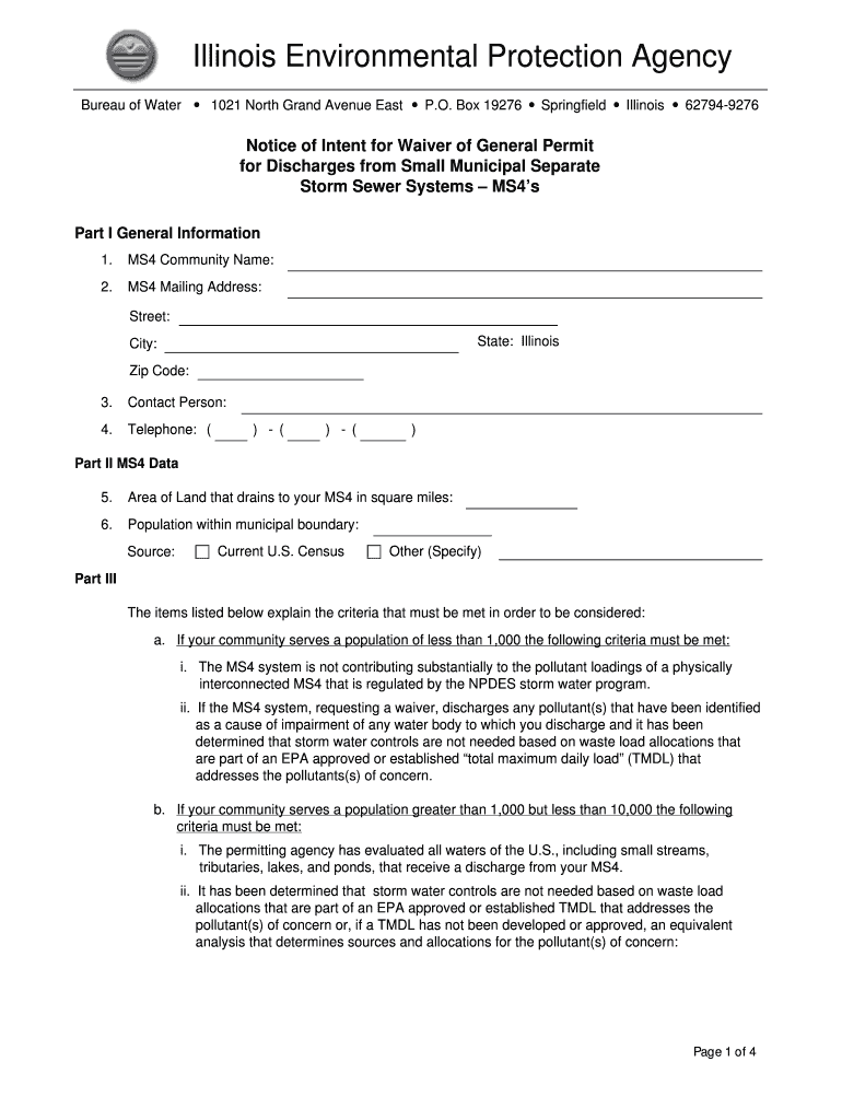 Get the free Notice of Intent for bWaiverb of MS4 Permit - bIllinoisb Environmental bb - epa stat...