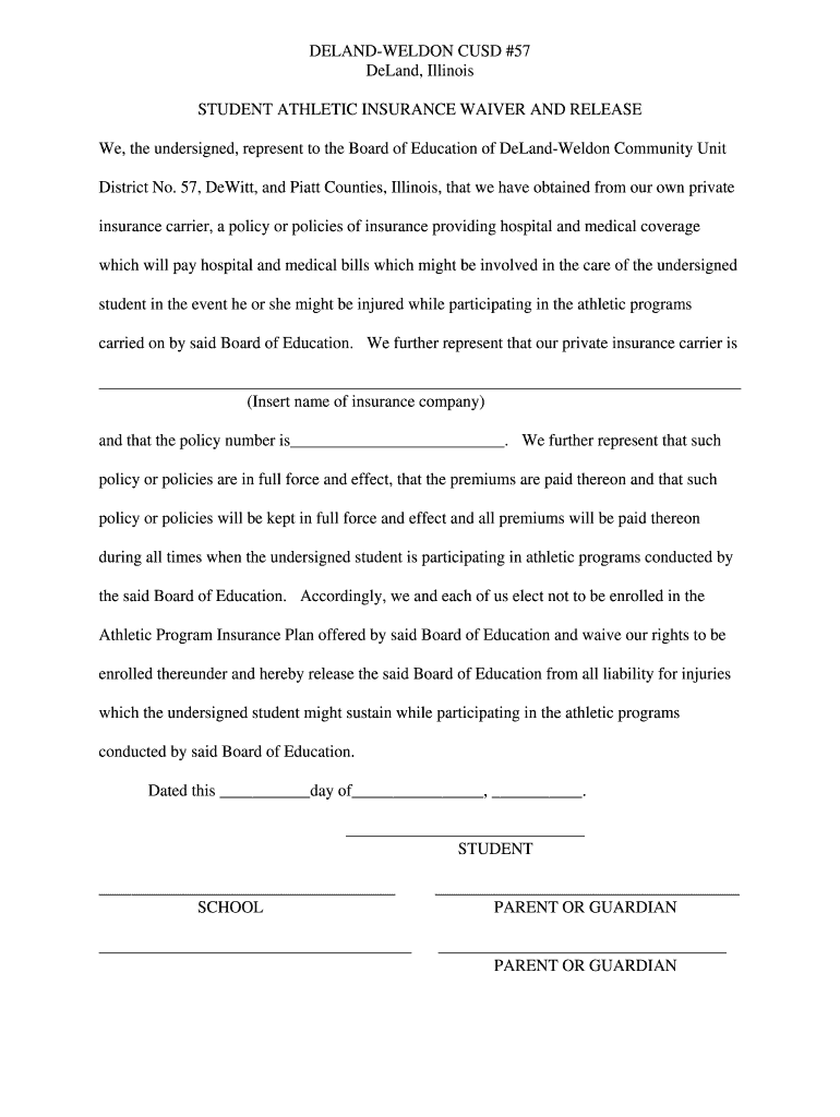 Print Form Clear Form DELANDWELDON CUSP #57 Demand, Illinois STUDENT ATHLETIC INSURANCE WAIVER AND RELEASE We, the undersigned, represent to the Board of Education of DeLandWeldon Community Unit District