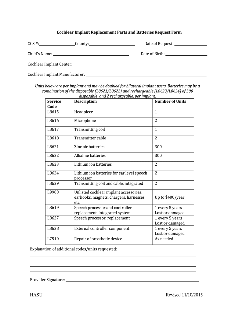 Get the free Cochlear Implant Replacement Parts and Batteries Request Form. Cochlear Implant Repl...