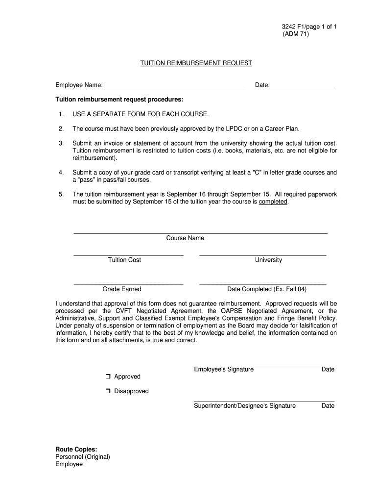 Employees who engage in educational courses or programs that qualify for reimbursement under their employer's tuition reimbursement policy are required to file a Tuition Reimbursement Request.