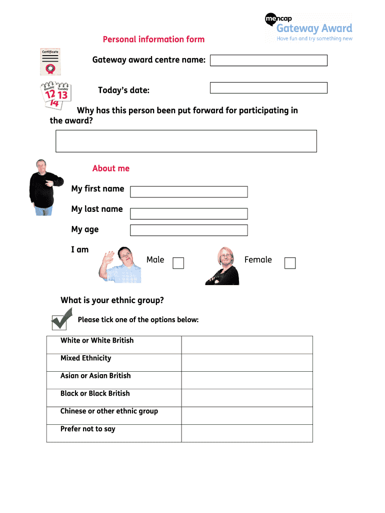 Personal information form Gateway award center name: Today's date: Why has this person been put forward for participating in the award? About me My first name * My last name My age I am Male What