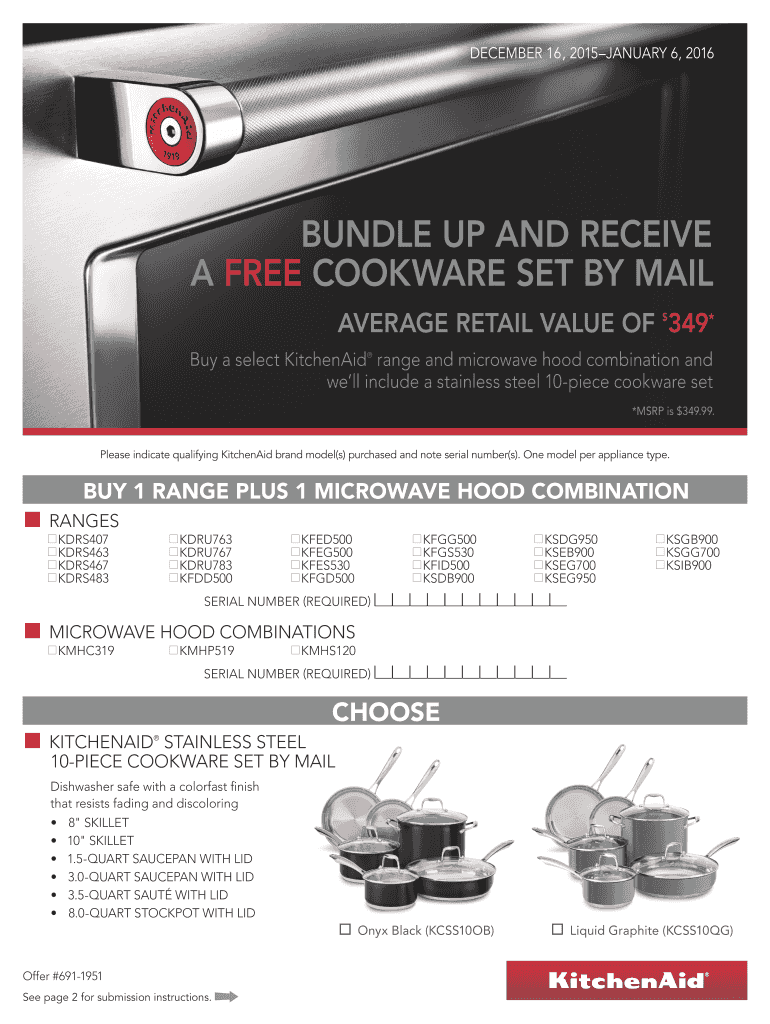 DECEMBER 16, 2015JANUARY 6, 2016 BUNDLE UP AND RECEIVE A FREE COOKWARE SET BY MAIL AVERAGE RETAIL VALUE OF 349* $ Buy a select Kitchen range and microwave hood combination and well include a stainless