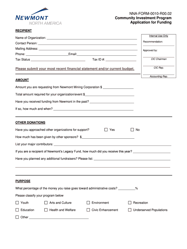 NNAFORM0010R00.02 Community Investment Program Application for Funding RECIPIENT Internal Use Only Name of Organization: Contact Person: Mailing Address: Phone: Email: Tax Status Tax ID #: Recommendation: