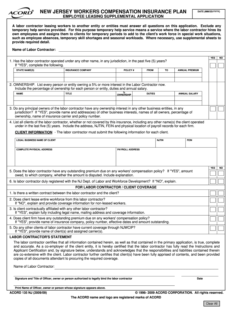 NEW JERSEY WORKERS COMPENSATION INSURANCE PLAN DATE (MM/DD/YYY) EMPLOYEE LEASING SUPPLEMENTAL APPLICATION A labor contractor leasing workers to another entity or entities must answer all questions