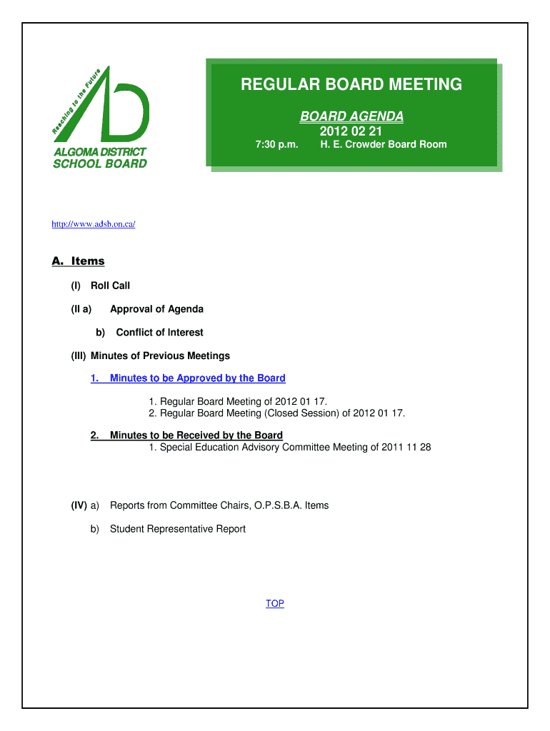 Regular Board Meeting REGULAR BOARD MEETING BOARD AGENDA 2012 02 21 7:30 p.m. H. E. Crowder Board Room http://www.adsb.on.ca/ A. Items (I) Roll Call (II a) Approval of Agenda b) Conflict of Interest