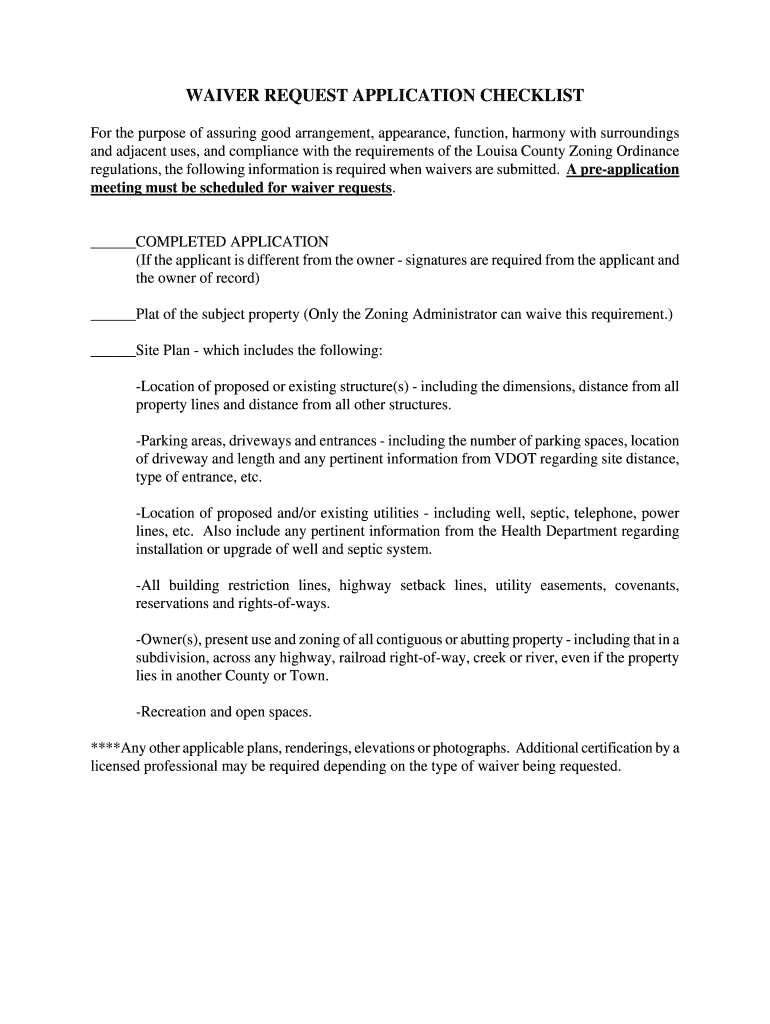 WAIVER REQUEST APPLICATION CHECKLIST For the purpose of assuring good arrangement, appearance, function, harmony with surroundings and adjacent uses, and compliance with the requirements of the Louisa