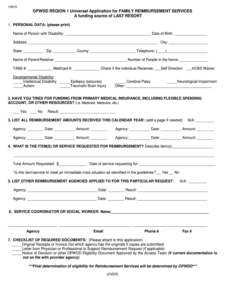 1/2015 ODD REGION 1 Universal Application for FAMILY REIMBURSEMENT SERVICES A funding source of LAST RESORT 1. PERSONAL DATA: (please print) Name of Person with Disability: Date of Birth: Address:
