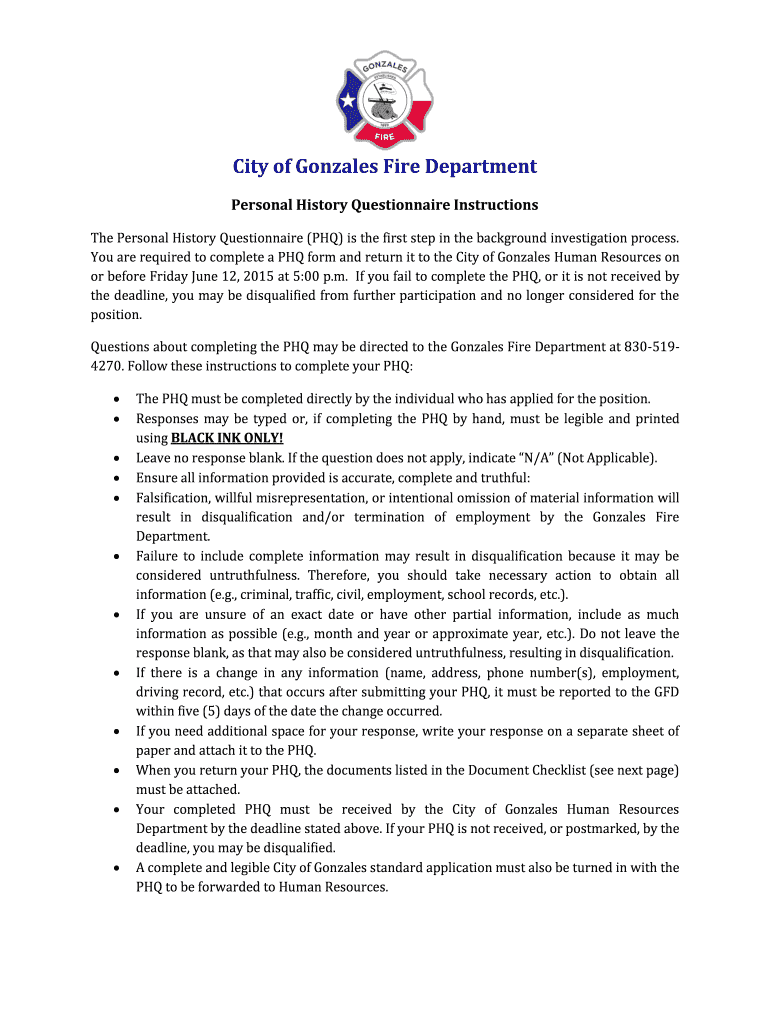 Get the free You are required to complete a PHQ form and return it to the City of Gonzales Human ...
