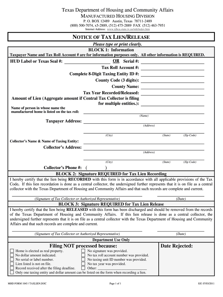 Get the free Notice of Tax LienRelease bformb - Texas - tdhcastatetxus - tdhca state tx