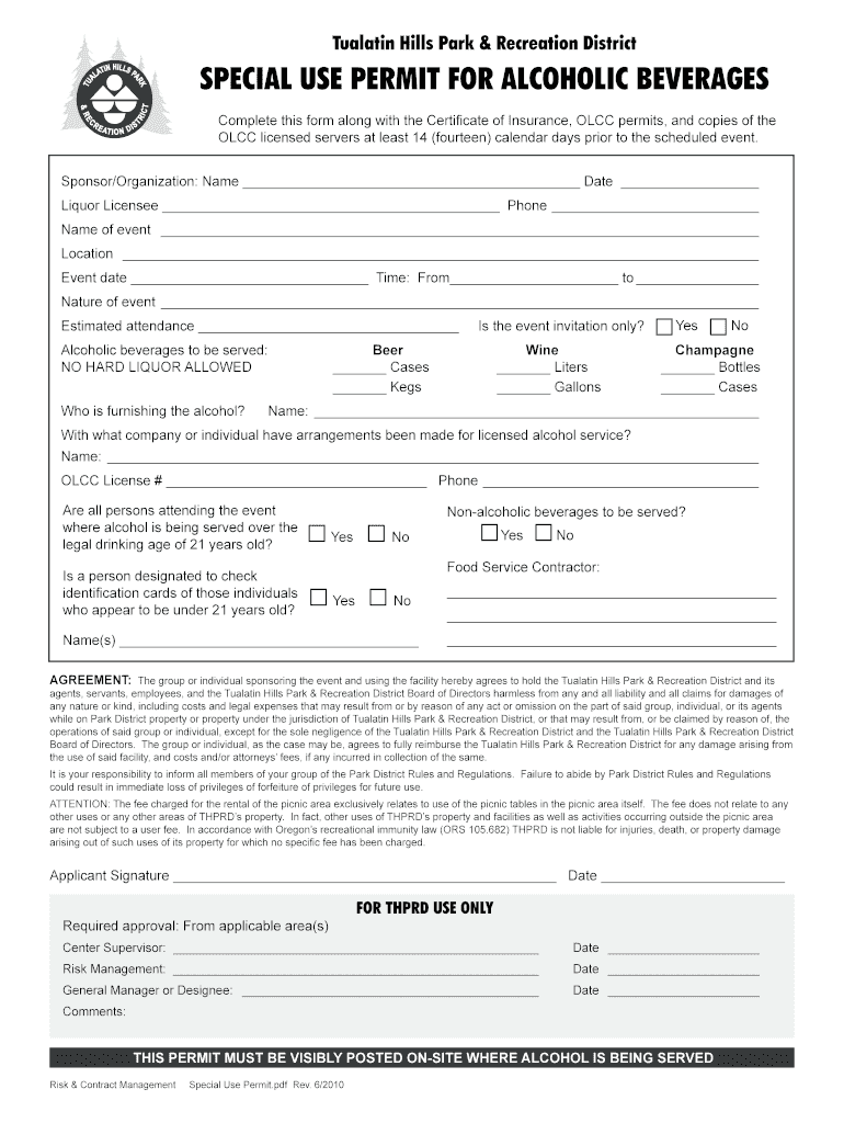 Get the free Special use bpermitb for alcoholic beverages - Tualatin Hills Park bb - thprd