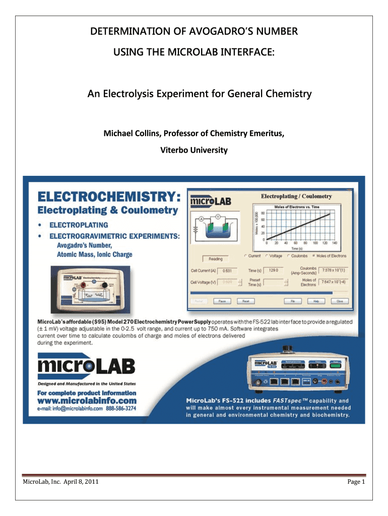 DETERMINATION OF AVOGADRO NUMBER USING THE MICROLOAN INTERFACE: An Electrolysis Experiment for General Chemistry Michael Collins, Professor of Chemistry Emeritus, Viterbo University MicroLab, Inc.