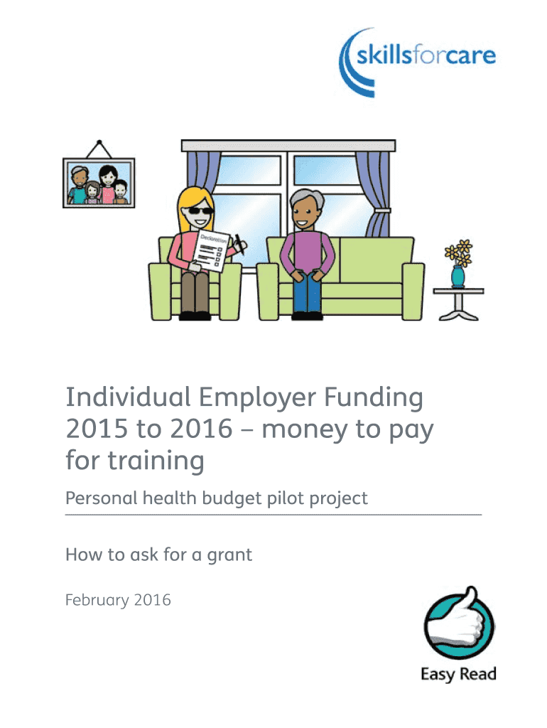 Individual Employer Funding 2015 to 2016 money to pay for training Personal health budget pilot project How to ask for a grant February 2016 Important Green writing In this easy read booklet we sometimes