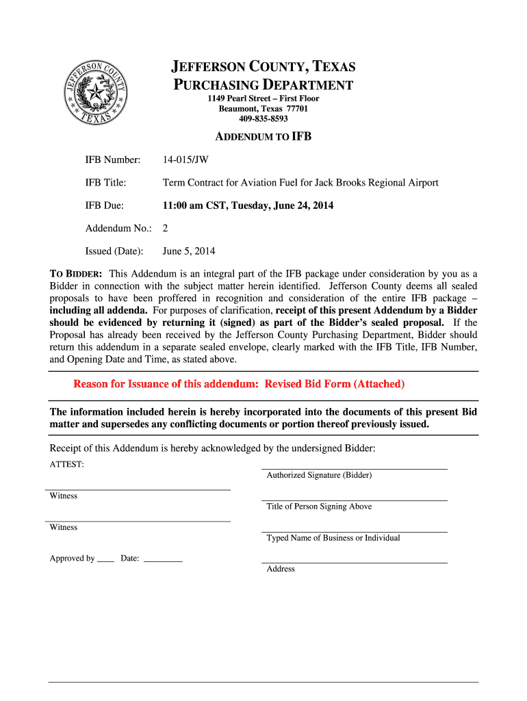 JEFFERSON COUNTY, TEXAS PURCHASING DEPARTMENT 1149 Pearl Street First Floor Beaumont, Texas 77701 4098358593 ADDENDUM TO IF Number: 14015/JR IF Title: Term Contract for Aviation Fuel for Jack Brooks
