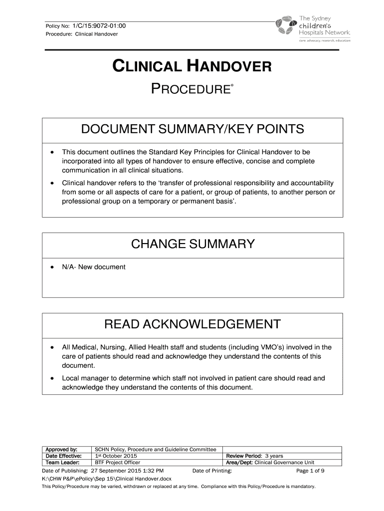 Policy No: 1/C/15:907201:00 Procedure: Clinical Handover PROCEDURE DOCUMENT SUMMARY/KEY POINTS This document outlines the Standard Key Principles for Clinical Handover to be incorporated into all