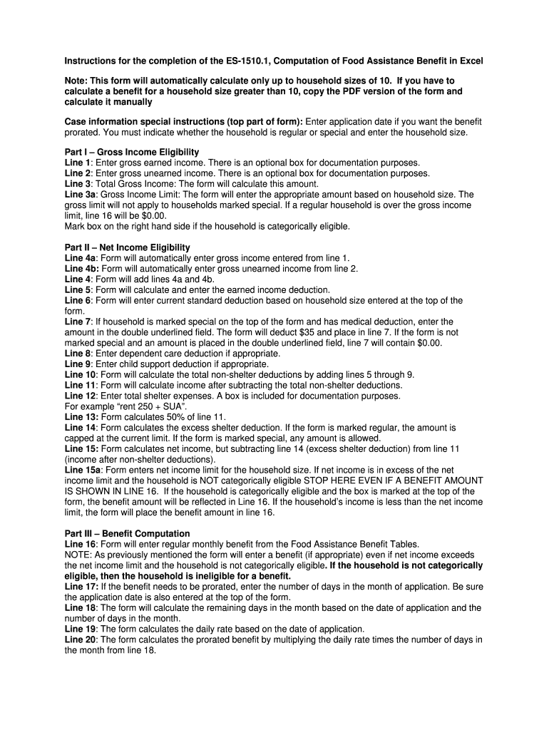 Instructions for the completion of the ES1510.1, Computation of Food Assistance Benefit in Excel