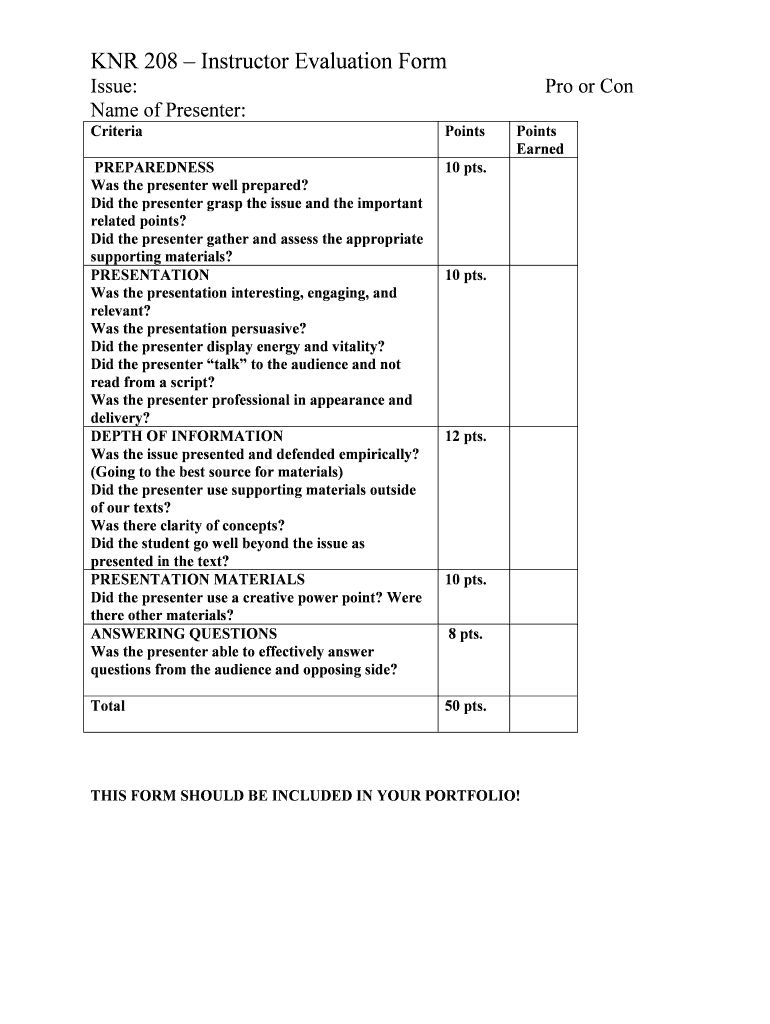CNR 208 Instructor Evaluation Form Issue: Name of Presenter: Pro or Con Criteria Points PREPAREDNESS Was the presenter well-prepared? Did the presenter grasp the issue and the important related points?