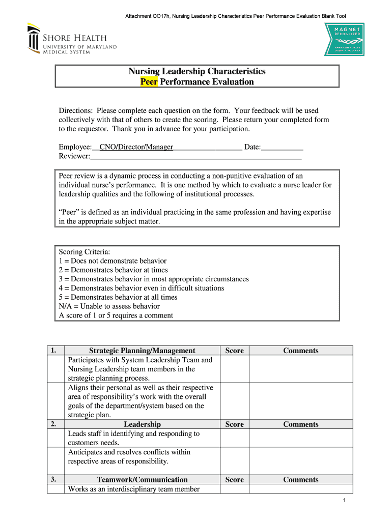Get the free Nursing Leadership Characteristics Peer Performance Evaluation - umms