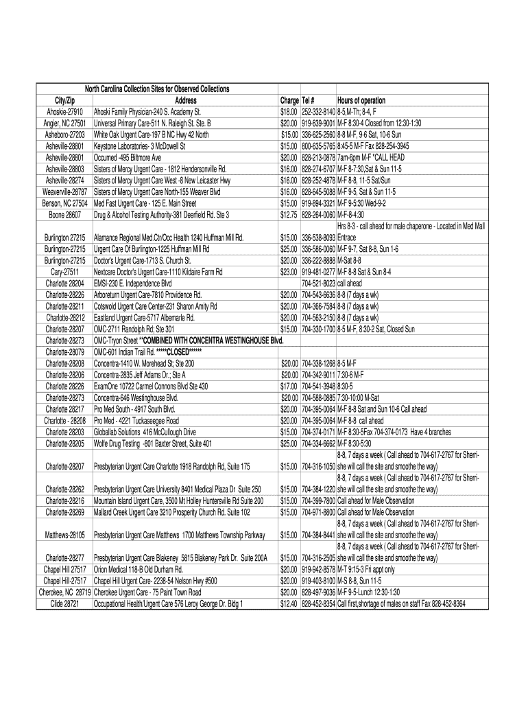 North Carolina Collection Sites for Observed Collections City/Zip Address Ahoskie27910 AHSI Family Physician240 S. Academy St. Anger, NC 27501 Universal Primary Care511 N. Raleigh St. Ste. B Asheboro27203