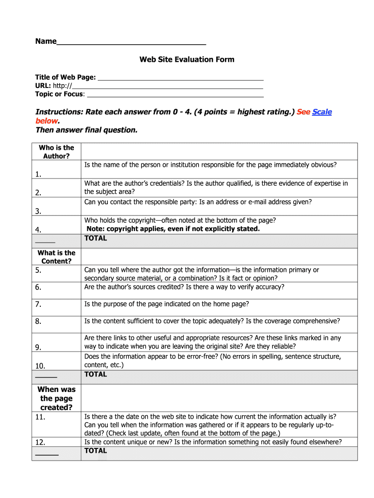 Name Website Evaluation Form Title of Web Page: URL: http:// Topic or Focus: Instructions: Rate each answer from 0 4. (4 points the highest rating.) See Scale below. Then answer final question. Who