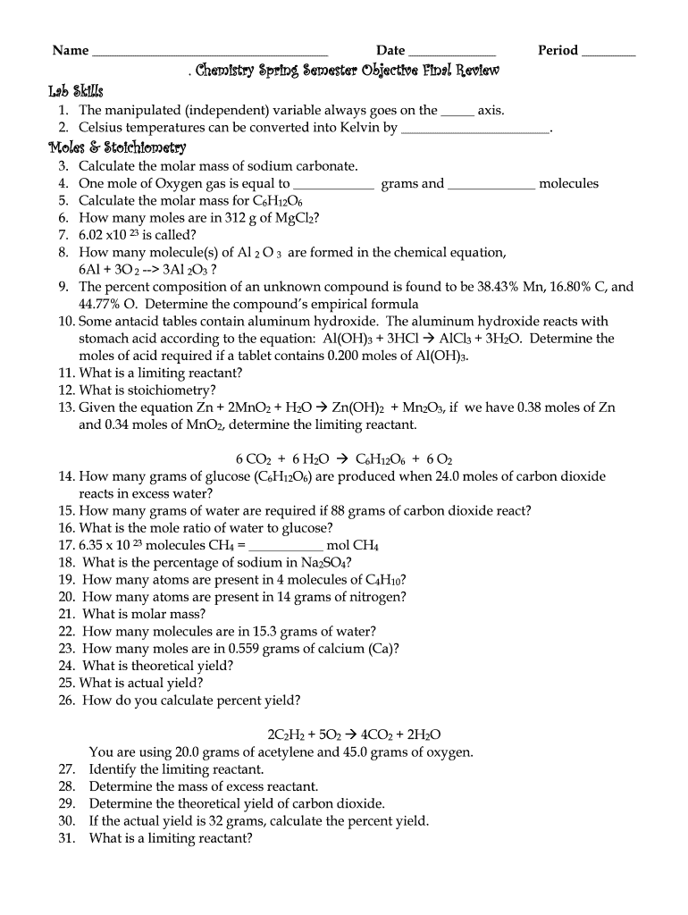 Name Date. Chemistry Spring Semester Objective Final Review Period Lab Skills 1. The manipulated (independent) variable always goes on the axis. 2. Celsius temperatures can be converted into Kelvin