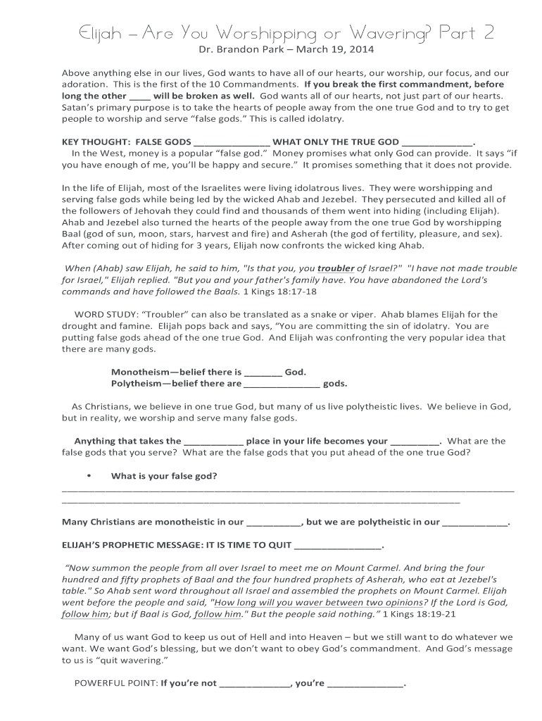 Elijah AreYouWorshippingorWavering? Part2 Dr. Brandon Park March 19, 2014, Above anything else in our lives, God wants to h ave all of our he arts, our worship, our focus, and our adoration. This