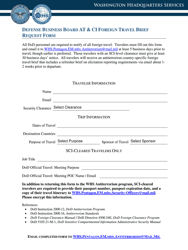 DEFENSE BUSINESS BOARD AT & CI FOREIGN TRAVEL BRIEF REQUEST FORM All DoD personnel are required to notify of all foreign travel. Travelers must fill out this form and email it to WHS. Pentagon.EM.mix.