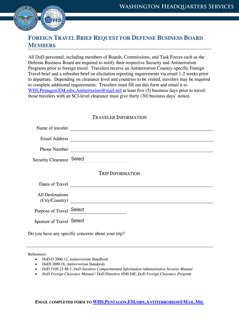 Get the free FOREIGN TRAVEL BRIEF REQUEST FOR DEFENSE BUSINESS BOARD - dbb defense