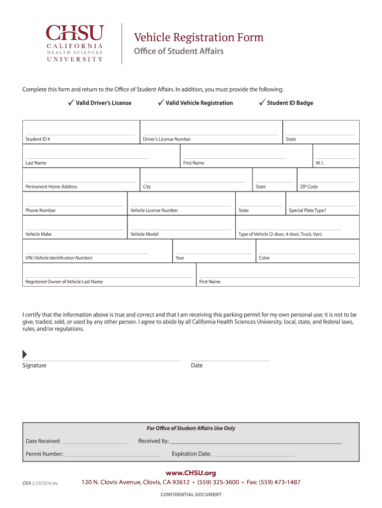 Vehicle Registration Form Office of Student Affairs Complete this form and return to the Office of Student Affairs. In addition, you must provide the following: Valid Driver's License Student ID #