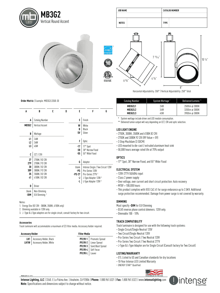 JOB NAME MB3G2 Vertical Round Accent CATALOG NUMBER NOTES TYPE 1 7 15/16 10 1/2 4 7/8 6 3/8 8 Horizontal Adjustability: 358 / Vertical Adjustability: 258 Total Order Matrix Example: MB3G2L335B30 A