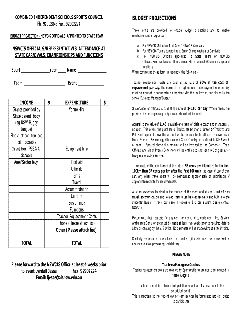 BUDGET PROJECTIONS COMBINED INDEPENDENT SCHOOLS SPORTS COUNCIL pH: 92992845 Fax: 92902274 Three forms are provided to reimbursement of expenses BUDGET PROJECTION NCIS OFFICIALS APPOINTED TO STATE