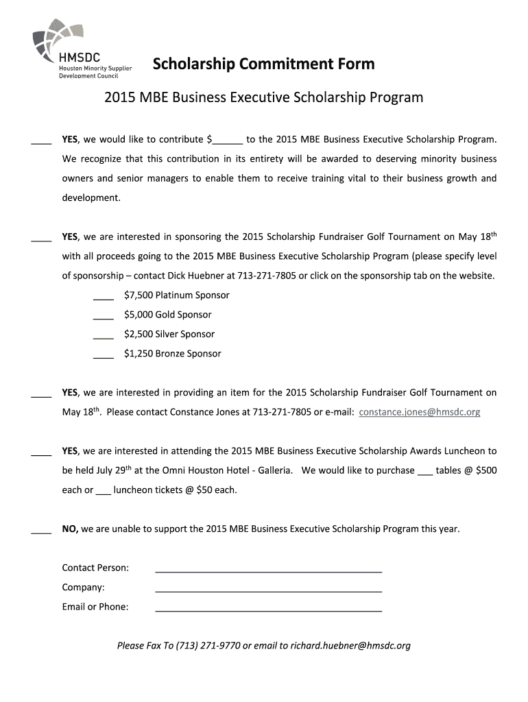 Scholarship Commitment Form 2015 BE Business Executive Scholarship Program YES, we would like to contribute $ to the 2015 BE Business Executive Scholarship Program. We recognize that this contribution