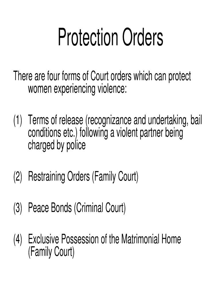 Protection Orders There are four forms of Court orders which can protect women experiencing violence: (1) Terms of release (recognizance and undertaking, bail conditions etc.) following a violent