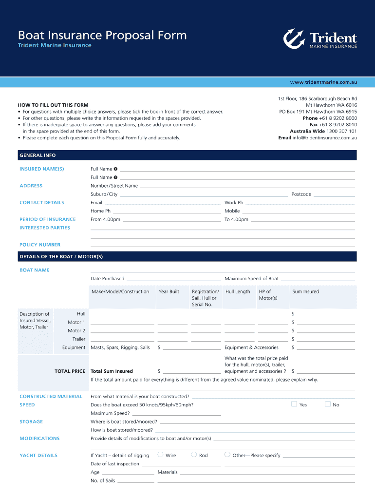Boat Insurance Proposal Form Trident Marine Insurance www.tridentmarine.com.au 1st Floor, 186 Scarborough Beach Rd Mt Hawthorn WA 6016 PO Box 191 Mt Hawthorn WA 6915 Phone +61 8 9202 8000 Fax +61