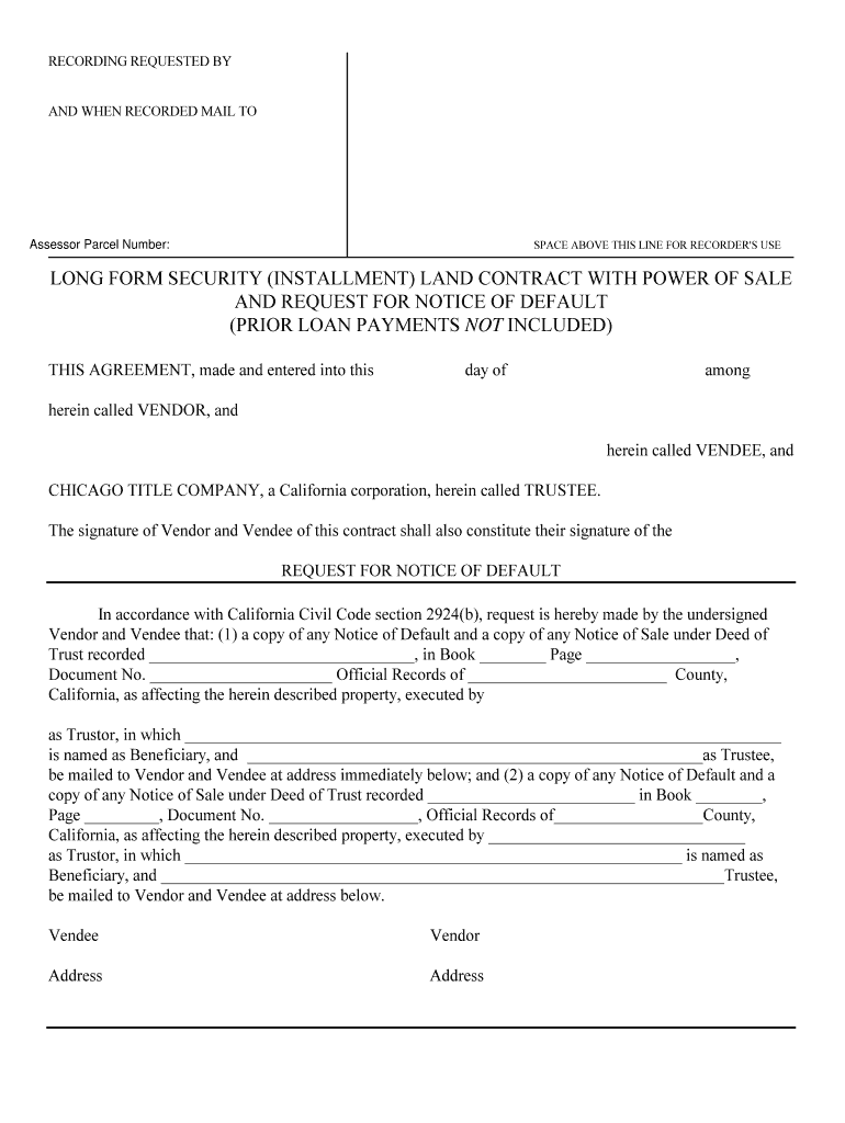 Print This Form RECORDING REQUESTED BY AND WHEN RECORDED MAIL TO SPACE ABOVE THIS LINE FOR RECORDER IS USE Assessor Parcel Number: LONG FORM SECURITY (INSTALLMENT) LAND CONTRACT WITH POWER OF SALE