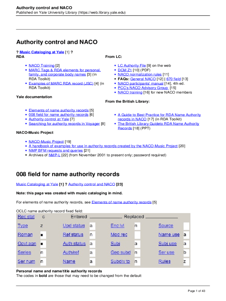 Authority control and NACO Published on Yale University Library (https://web.library.yale.edu)Authority control and NACO ? Music Cataloging at Yale [1] ? RDA NACO Training [2] MARC Tags & RDA elements