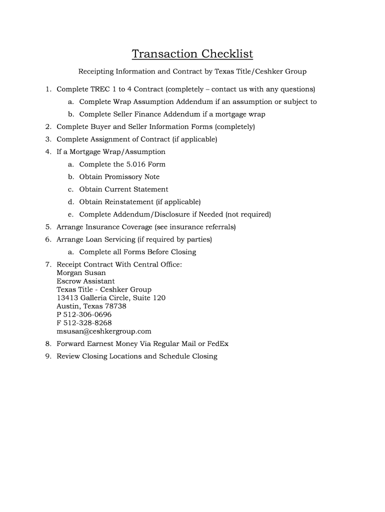 Transaction Checklist Receipting Information and Contract by Texas Title/Cashier Group 1. Complete TREE 1 to 4 Contract (completely contact us with any questions) a. Complete Wrap Assumption Addendum