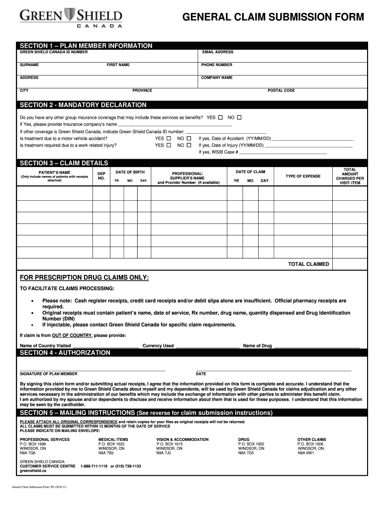 GENERAL CLAIM SUBMISSION FORM SECTION 1 PLAN MEMBER INFORMATION GREEN SHIELD CANADA ID NUMBER EMAIL ADDRESS SURNAME FIRST NAME PHONE NUMBER ADDRESS COMPANY NAME CITY PROVINCE POSTAL CODE SECTION 2