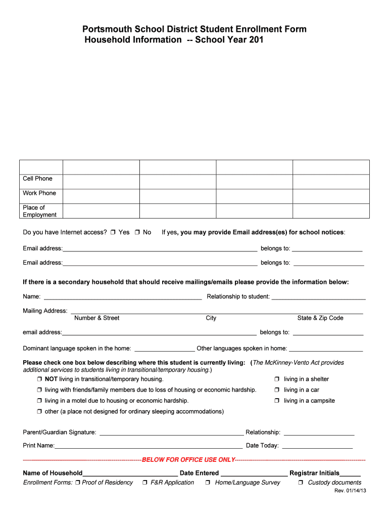 This document is used to collect information for student enrollment in the Portsmouth School District, including household information, parent/guardian details, and living situation.