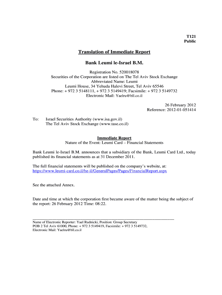 Get the free Translation of Immediate Report Re Leumi Card Financial Statements for 31 December 2...