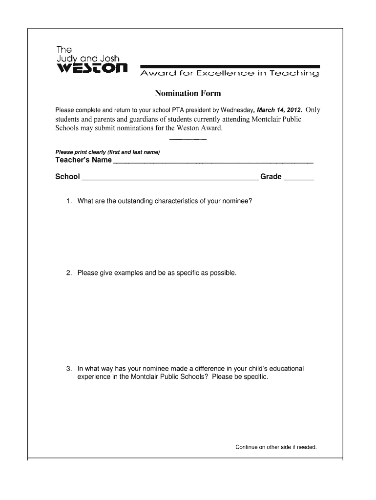 Nomination Form Please complete and return to your school PTA president by Wednesday, March 14, 2012. Students and parents and guardians of students currently attending Montclair Public Schools may