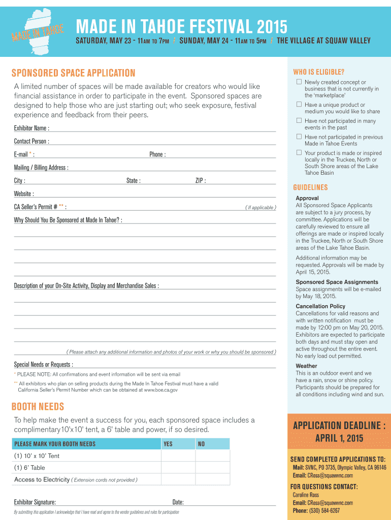 MADE IN TAHOE FESTIVAL 2015 SATURDAY, MAY 23 11am to 7pm / SUNDAY, MAY 24 11am to 5pm / THE VILLAGE AT SQUAW VALLEY SPONSORED SPACE APPLICATION WHO IS ELIGIBLE? A limited number of spaces will be