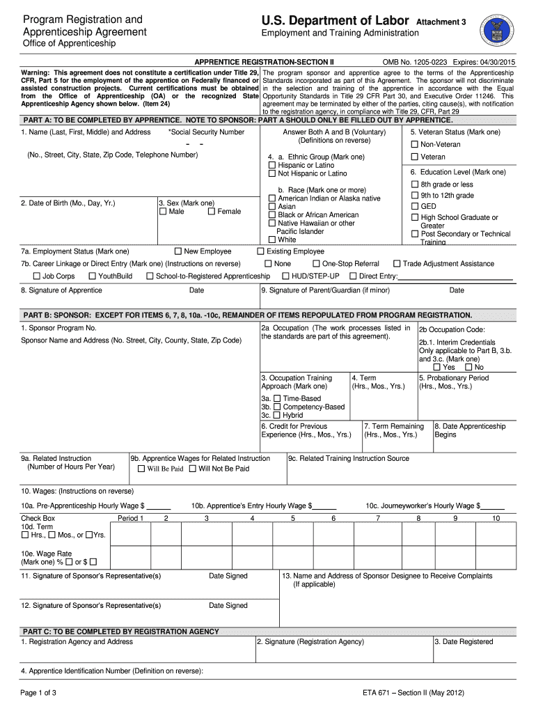 Program Registration and Apprenticeship Agreement U.S. Department of Labor Attachment 3 Employment and Training Administration Office of Apprenticeship APPRENTICE REGISTRATIONSECTION II Warning: This