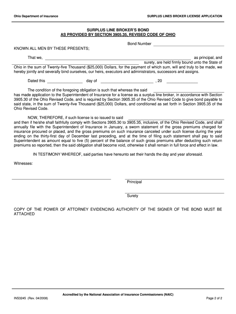 This document is an application for obtaining a surplus lines broker license in Ohio, detailing necessary personal information, background information, and compliance requirements as per the Ohio