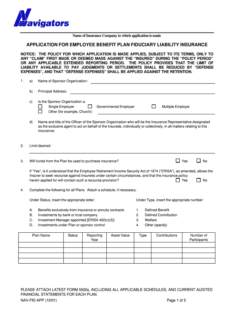 Name of Insurance Company to which application is made APPLICATION FOR EMPLOYEE BENEFIT PLAN FIDUCIARY LIABILITY INSURANCE NOTICE: THE POLICY FOR WHICH APPLICATION IS MADE APPLIES, SUBJECT TO ITS