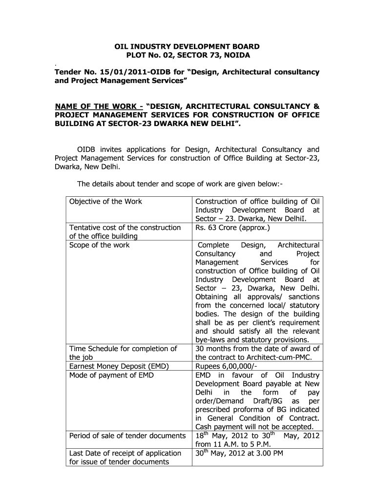 OIL INDUSTRY DEVELOPMENT BOARD PLOT No. 02, SECTOR 73, NOIDA. Tender No. 15/01/2011OIDB for Design, Architectural consultancy and Project Management Services NAME OF THE WORK DESIGN, ARCHITECTURAL