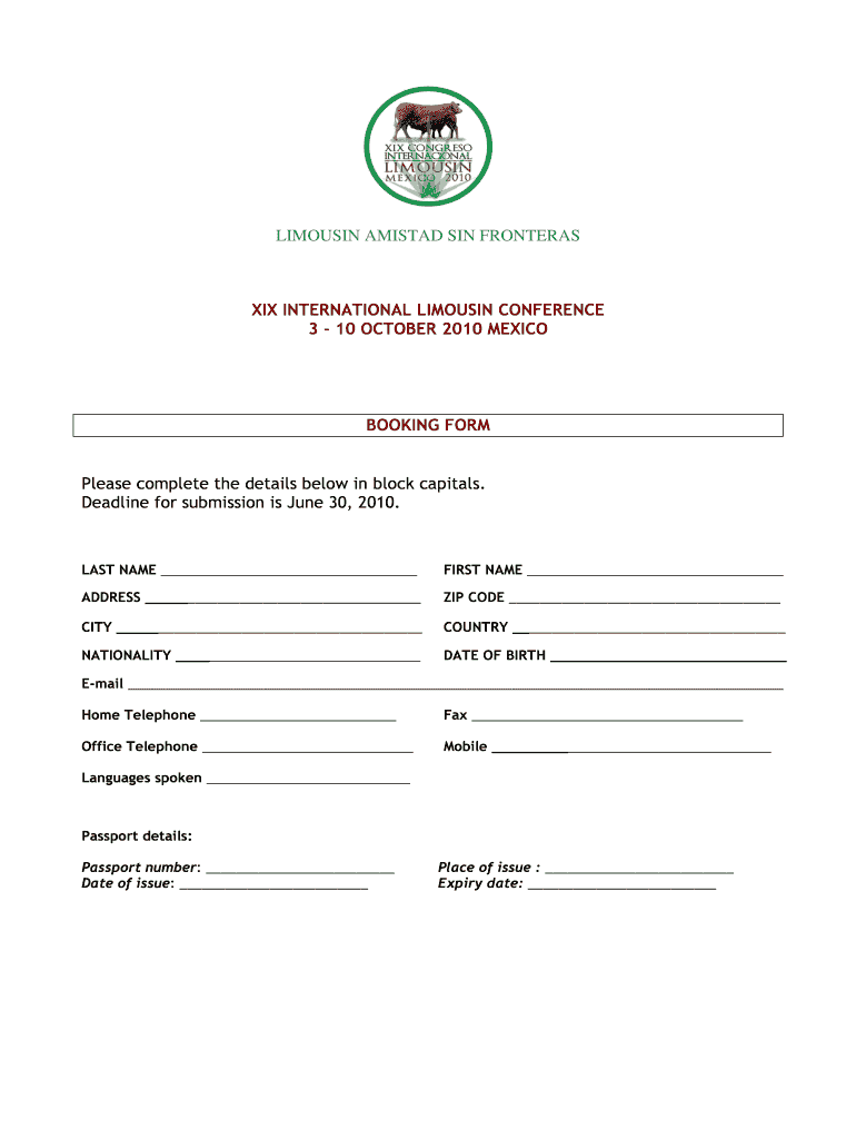 LIMOUSIN AMISTAD SIN FRONTERA XIX INTERNATIONAL LIMOUSIN CONFERENCE 3 10 OCTOBER 2010 MEXICO BOOKING FORM Please complete the details below in block capitals. Deadline for submission is June 30, 2010.