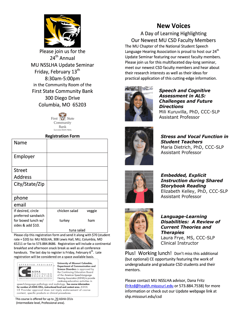 New Voices A Day of Learning To highlight Our Newest MU CSD Faculty Members Please join us for the 24th Annual MU NISHA Update Seminar Friday, February 13th 8:30am5:00pm The MU Chapter of the National